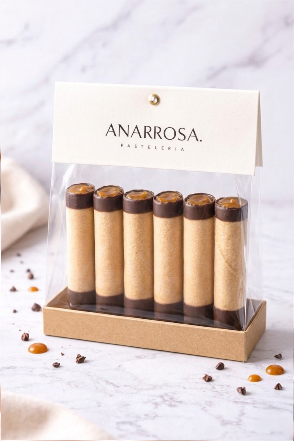 6 unidades de crujiente barquillo relleno con una delicada capa de chocolate semi amargo de alta calidad, con un interior de manjar casero de puerto Varas.