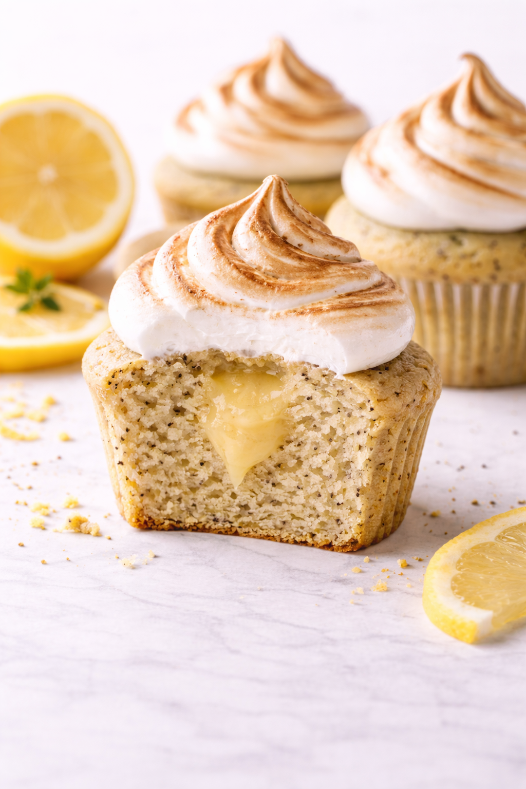 Esponjoso bizcocho de vainilla con amapolas, relleno con el clásico relleno de leche condensada y limón sutil, terminando con un merengue suizo.