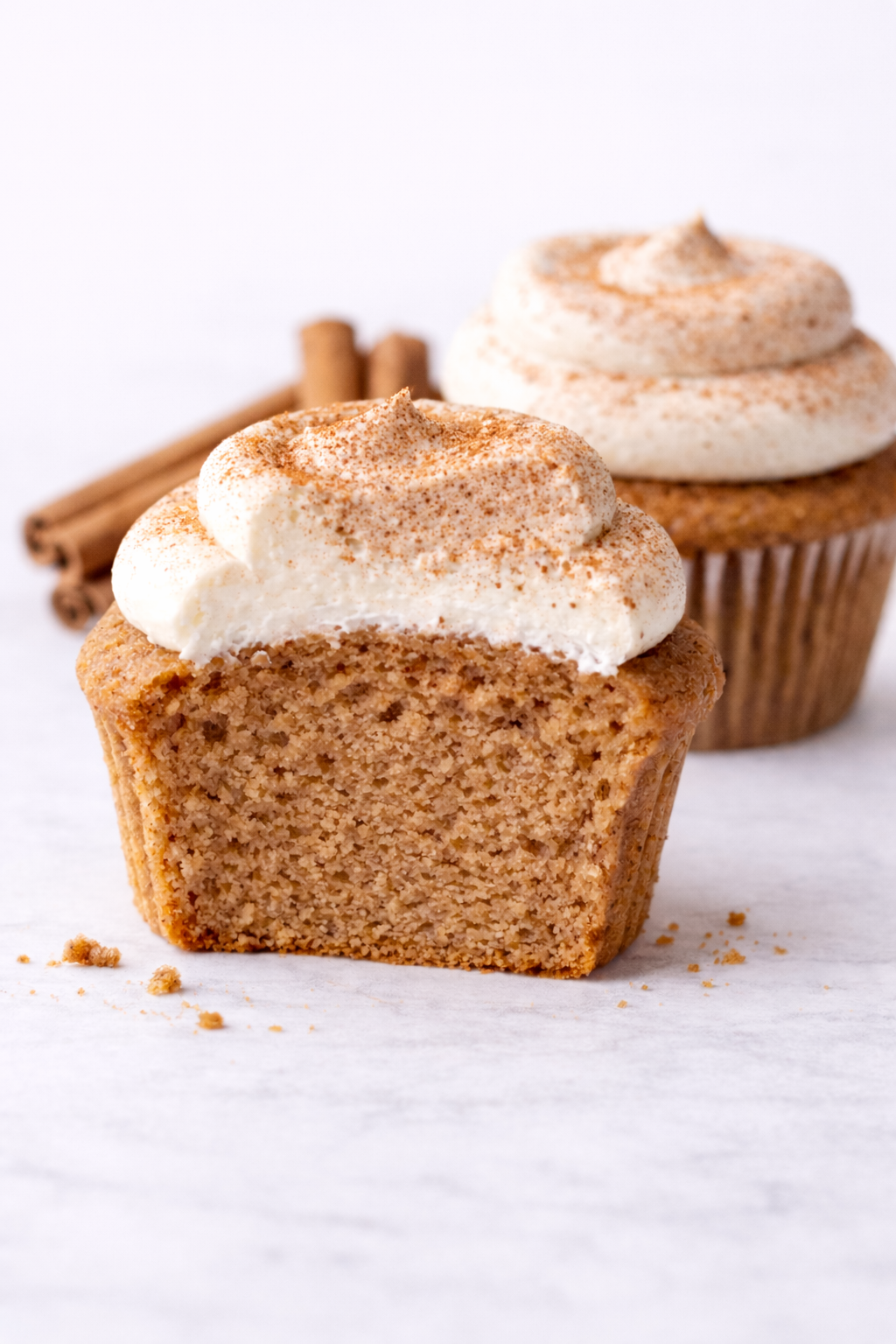 Bizcocho especiado de canela, suave y aromático, coronado con frosting de canela. Todo el sabor de un cinnamon roll, hecho cupcake.