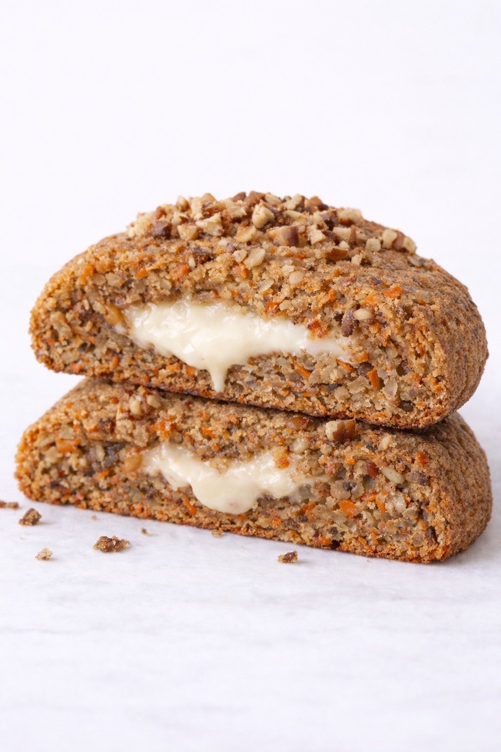 Galleta de zanahoria ligera y especiada, con insert de frosting de queso crema y nueces.