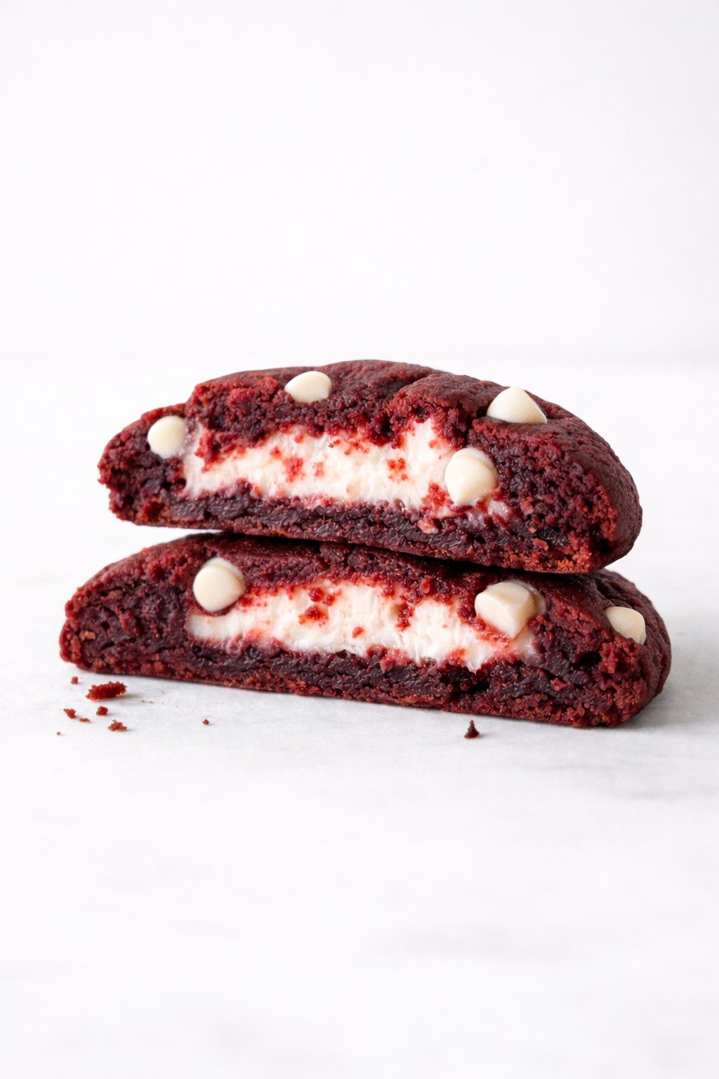 Galleta de intenso color rojo, con un delicado insert de frosting de queso crema y chips de chocolate blanco de alta calidad.