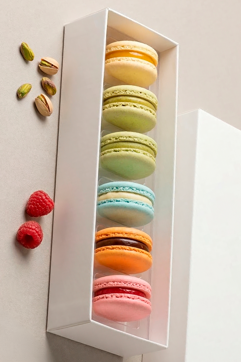 Delicada selección de macarons artesanales con rellenos de ganache y centros de gel frutal. Textura ligera, crocante por fuera y suave en su interior. Disponibles en caja de 6 unidades, perfectos para regalar o compartir.