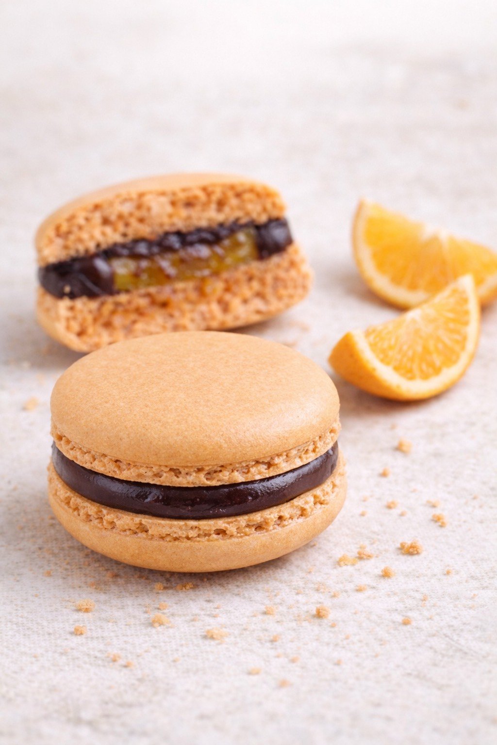 Galleta a base de harina de almendra, rellena con Ganache de chocolate amargo de alta calidad con un centro de gel de naranja.