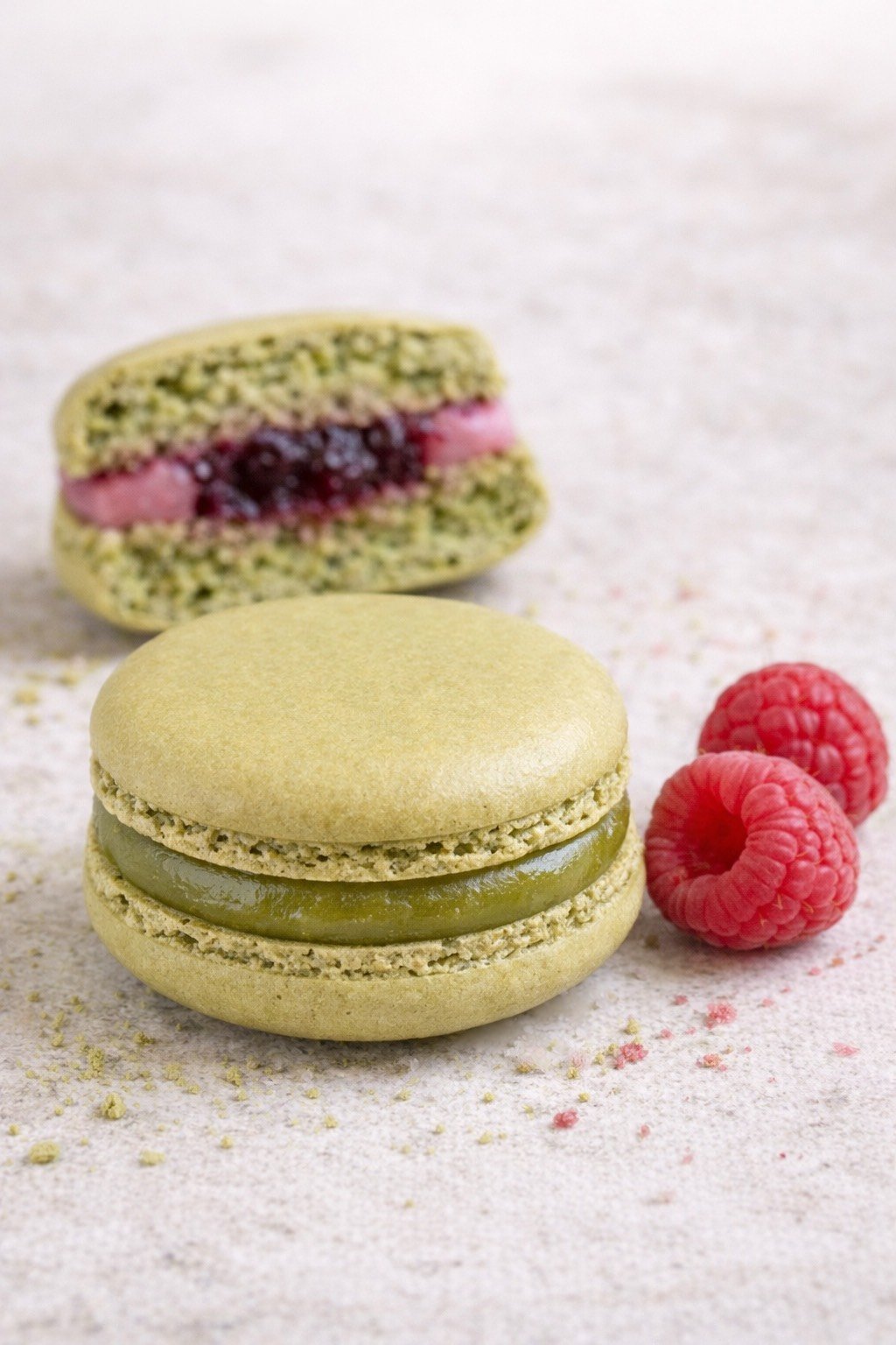 Galleta a base de harina de almendra y merengue. Rellena de ganache de te matcha con un centro de gel de frambuesa.